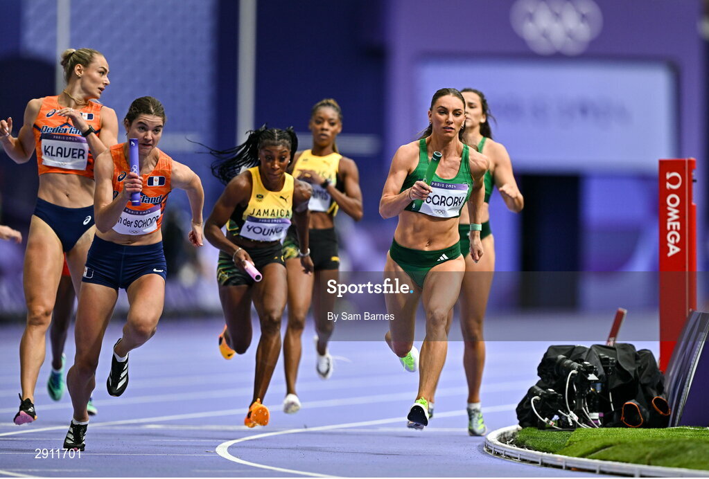 9 August 2024; Kelly McGrory of Team Ireland receives the baton during the women's 4 x 400m relay round 1 at the Stade de France during the 2024 Paris Summer Olympic Games in Paris, France. Photo by Sam Barnes/Sportsfile