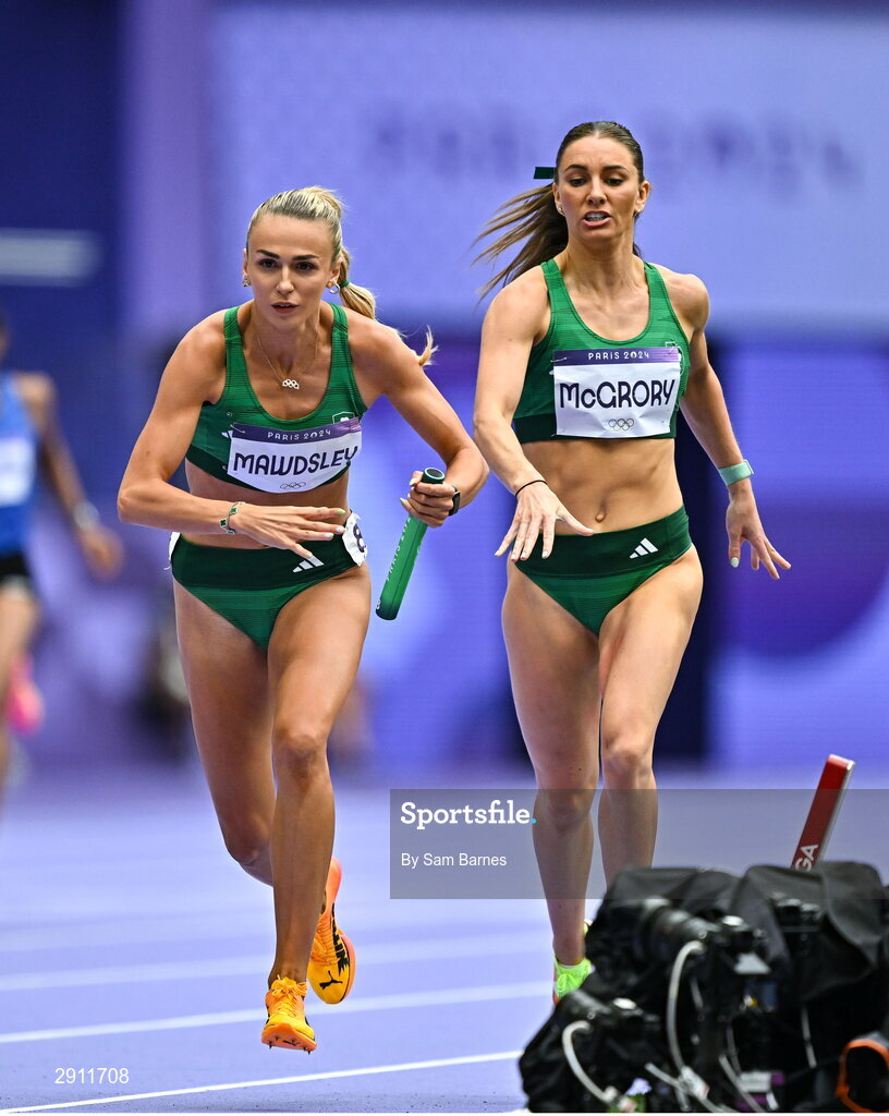 9 August 2024; Sharlene Mawdsley of Team Ireland receives the baton from Kelly McGrory in action during the women's 4 x 400m relay round 1 at the Stade de France during the 2024 Paris Summer Olympic Games in Paris, France. Photo by Sam Barnes/Sportsfile
