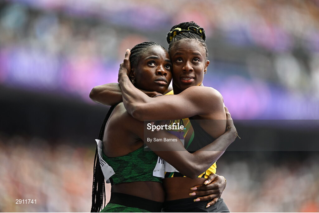 9 August 2024; Tobi Amusan of Team Nigeria and Danielle Williams of Team Jamaica in action after the women's 100m hurdles semi-final at the Stade de France during the 2024 Paris Summer Olympic Games in Paris, France. Photo by Sam Barnes/Sportsfile