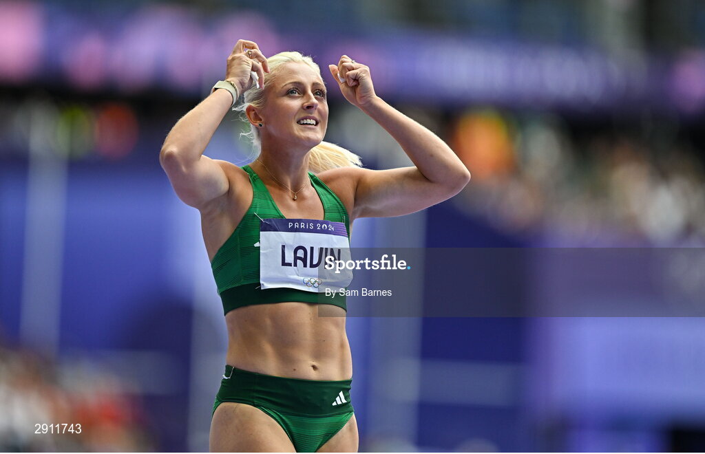 9 August 2024; Sarah Lavin of Team Ireland reacts after the women's 100m hurdles semi-final at the Stade de France during the 2024 Paris Summer Olympic Games in Paris, France. Photo by Sam Barnes/Sportsfile
