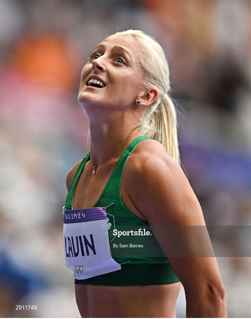 9 August 2024; Sarah Lavin of Team Ireland reacts after the women's 100m hurdles semi-final at the Stade de France during the 2024 Paris Summer Olympic Games in Paris, France. Photo by Sam Barnes/Sportsfile