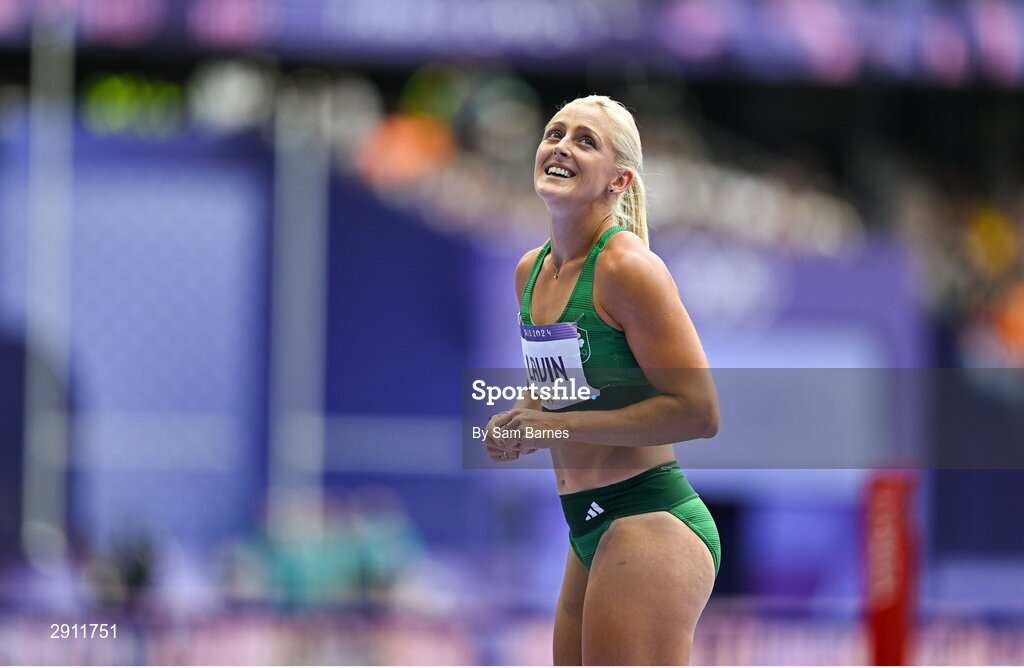9 August 2024; Sarah Lavin of Team Ireland reacts after the women's 100m hurdles semi-final at the Stade de France during the 2024 Paris Summer Olympic Games in Paris, France. Photo by Sam Barnes/Sportsfile