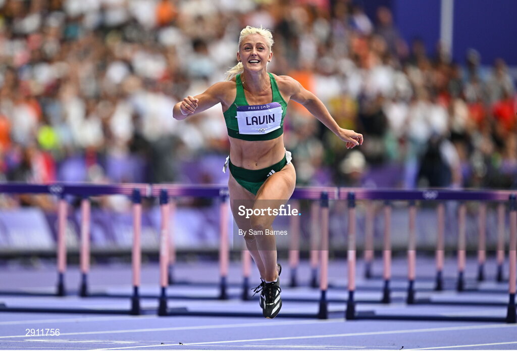 9 August 2024; Sarah Lavin of Team Ireland crosses the line during the women's 100m hurdles semi-final at the Stade de France during the 2024 Paris Summer Olympic Games in Paris, France. Photo by Sam Barnes/Sportsfile