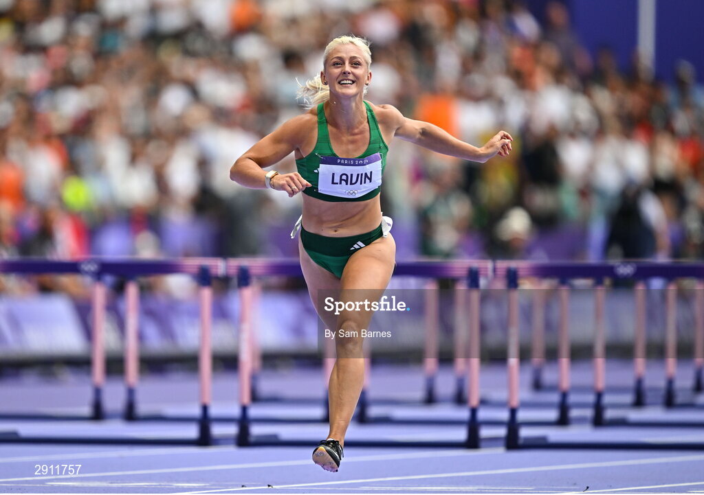 9 August 2024; Sarah Lavin of Team Ireland crosses the line during the women's 100m hurdles semi-final at the Stade de France during the 2024 Paris Summer Olympic Games in Paris, France. Photo by Sam Barnes/Sportsfile