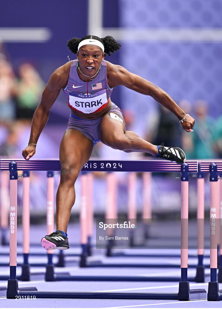 9 August 2024; Grace Stark of Team United States in action during the women's 100m hurdles semi-final at the Stade de France during the 2024 Paris Summer Olympic Games in Paris, France. Photo by Sam Barnes/Sportsfile