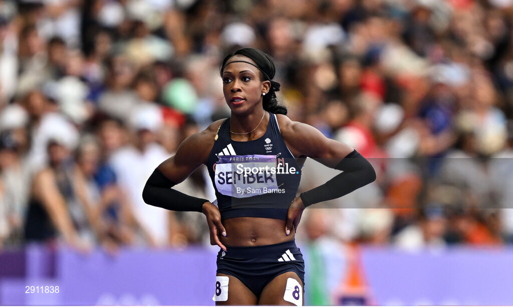 9 August 2024; Cindy Sember of Team Great Britain walks off the track after failing to finish the women's 100m hurdles semi-final at the Stade de France during the 2024 Paris Summer Olympic Games in Paris, France. Photo by Sam Barnes/Sportsfile