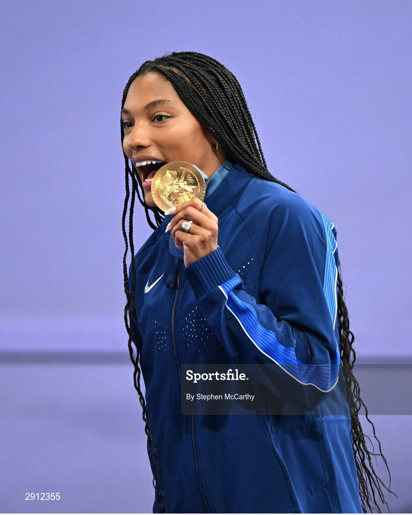 9 August 2024; Women's Long Jump gold medalist Tara Davis-Woodhall of Team USA during the 2024 Paris Summer Olympic Games in Paris, France. Photo by Stephen McCarthy/Sportsfile