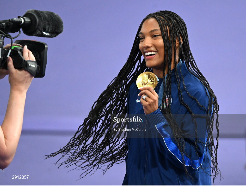 9 August 2024; Women's Long Jump gold medalist Tara Davis-Woodhall of Team USA during the 2024 Paris Summer Olympic Games in Paris, France. Photo by Stephen McCarthy/Sportsfile