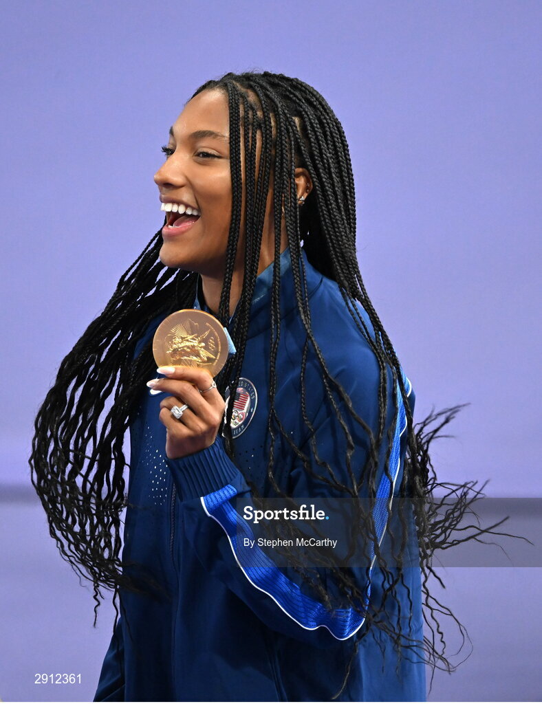 9 August 2024; Women's Long Jump gold medalist Tara Davis-Woodhall of Team USA during the 2024 Paris Summer Olympic Games in Paris, France. Photo by Stephen McCarthy/Sportsfile
