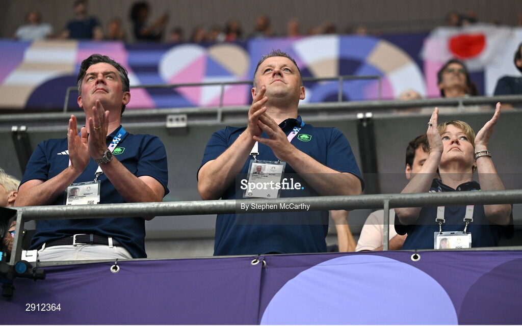 9 August 2024; Minister of State for Sport and Physical Education Thomas Byrne, centre, with Olympic Federation of Ireland chief executive Peter Sherrard, left, and Sarah O'Shea, General Secretary, Olympic Federation of Ireland in attendance before the women's 400m final at the Stade de France during the 2024 Paris Summer Olympic Games in Paris, France. Photo by Stephen McCarthy/Sportsfile