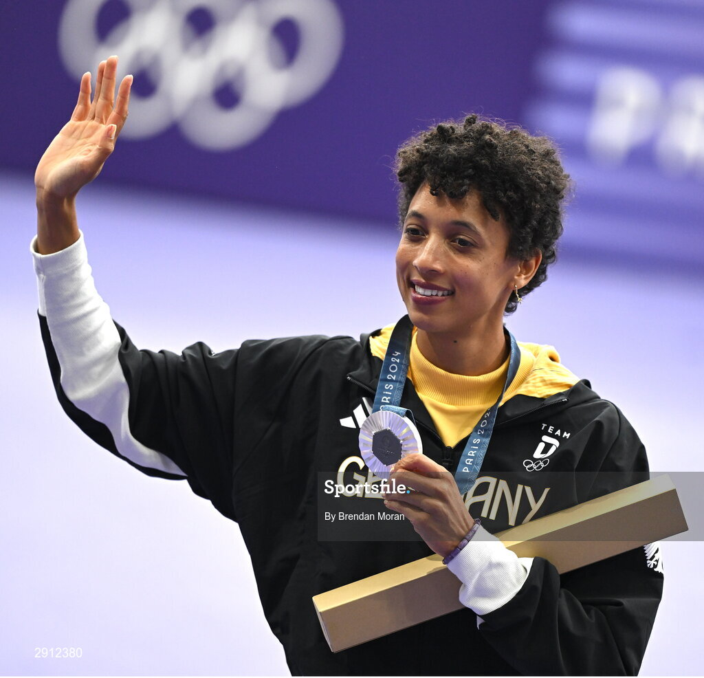 9 August 2024; Women's Long Jump silver medalist Malaika Mihambo of Team Germany celebrates with her medal at the Stade de France during the 2024 Paris Summer Olympic Games in Paris, France. Photo by Brendan Moran/Sportsfile