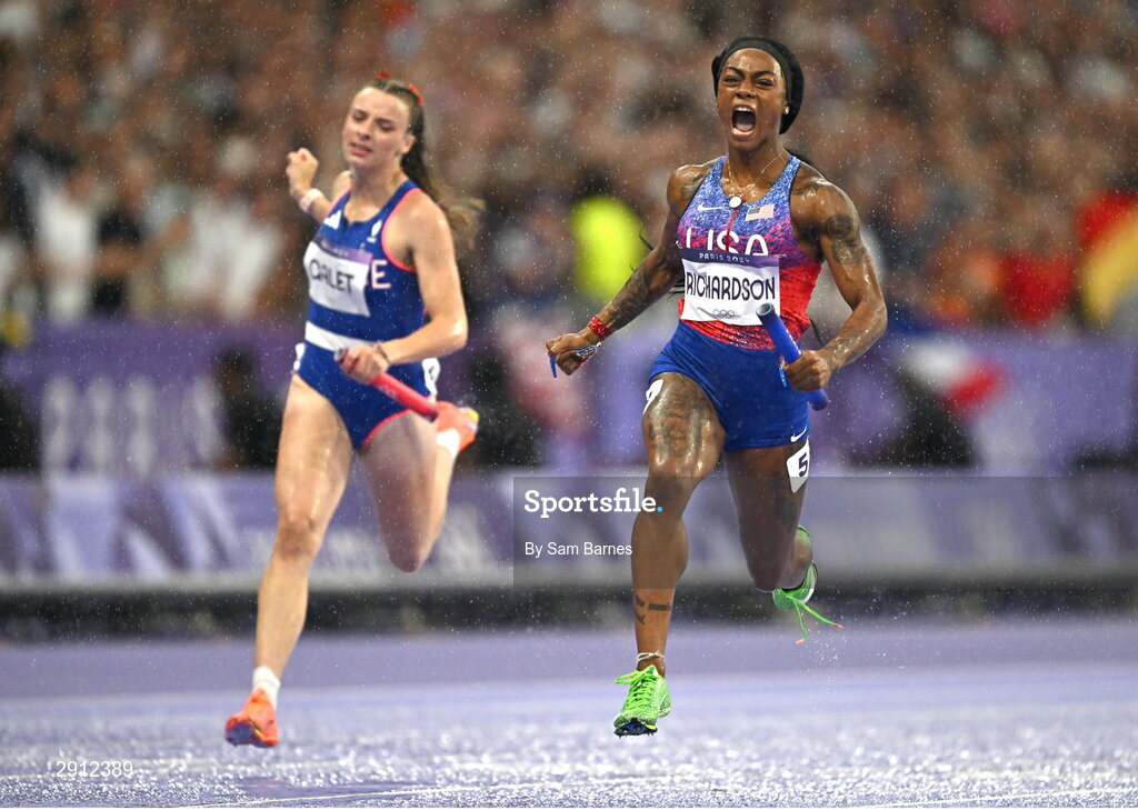 9 August 2024; Sha'carri Richardson of Team USA celebrates winning the women's 4x100m relay at the Stade de France during the 2024 Paris Summer Olympic Games in Paris, France. Photo by Sam Barnes/Sportsfile