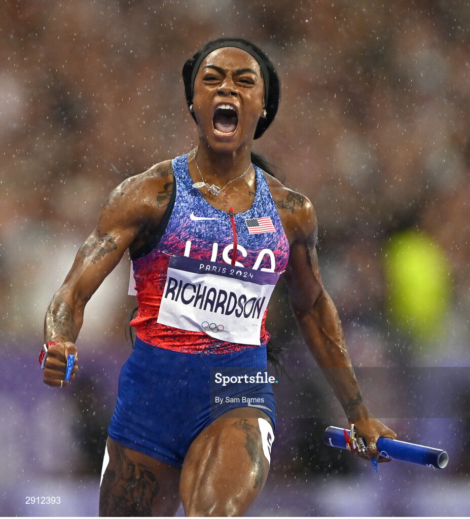 9 August 2024; Sha'carri Richardson of Team USA celebrates winning the women's 4x100m relay at the Stade de France during the 2024 Paris Summer Olympic Games in Paris, France. Photo by Sam Barnes/Sportsfile