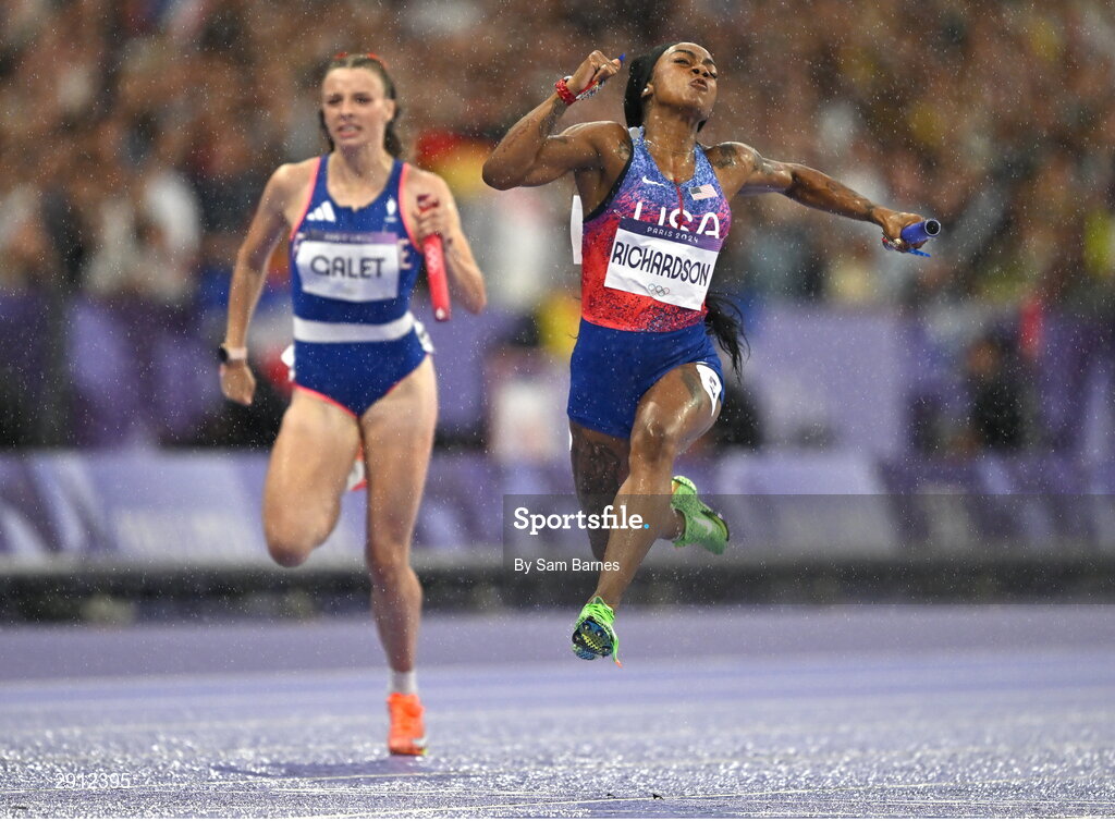 9 August 2024; Sha'carri Richardson of Team USA crosses the finish line to win the women's 4x100m relay at the Stade de France during the 2024 Paris Summer Olympic Games in Paris, France. Photo by Sam Barnes/Sportsfile