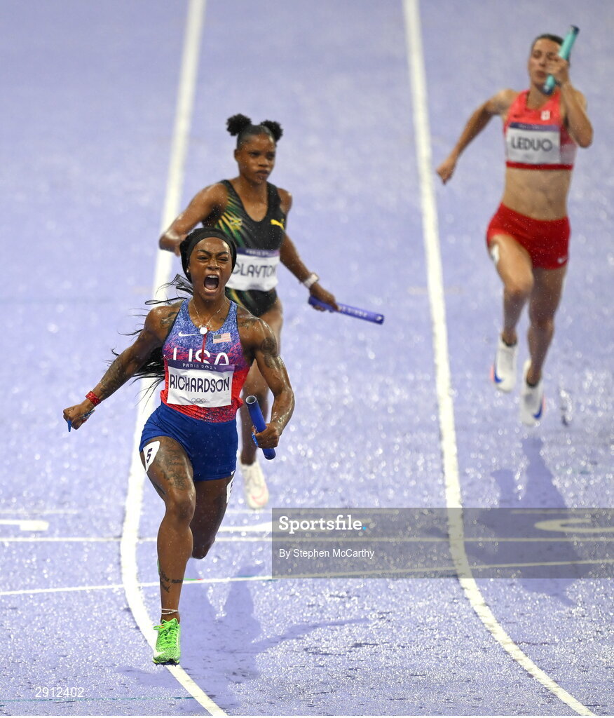 9 August 2024; Sha'carri Richardson of Team USA celebrates winning the women's 4x100m relay at the Stade de France during the 2024 Paris Summer Olympic Games in Paris, France. Photo by Stephen McCarthy/Sportsfile
