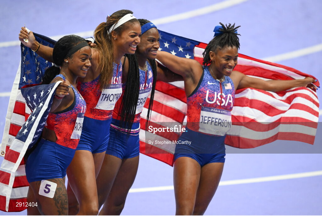 9 August 2024; The Team USA 4x100 relay team, from left, Sha'carri Richardson, Gabrielle Thomas, Twanisha Terry and Melissa Jefferson celebrate after winning gold in the women's 4x100m relay at the Stade de France during the 2024 Paris Summer Olympic Games in Paris, France. Photo by Stephen McCarthy/Sportsfile