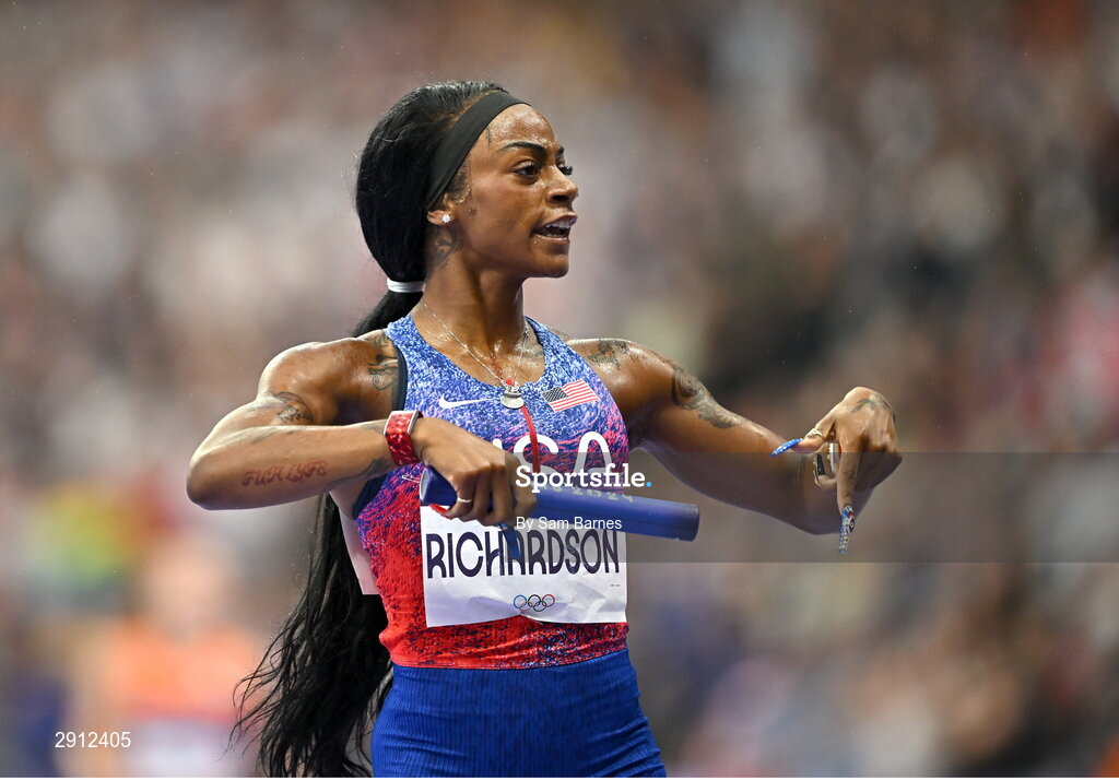 9 August 2024; Sha'carri Richardson of Team USA celebrates winning the women's 4x100m relay at the Stade de France during the 2024 Paris Summer Olympic Games in Paris, France. Photo by Sam Barnes/Sportsfile