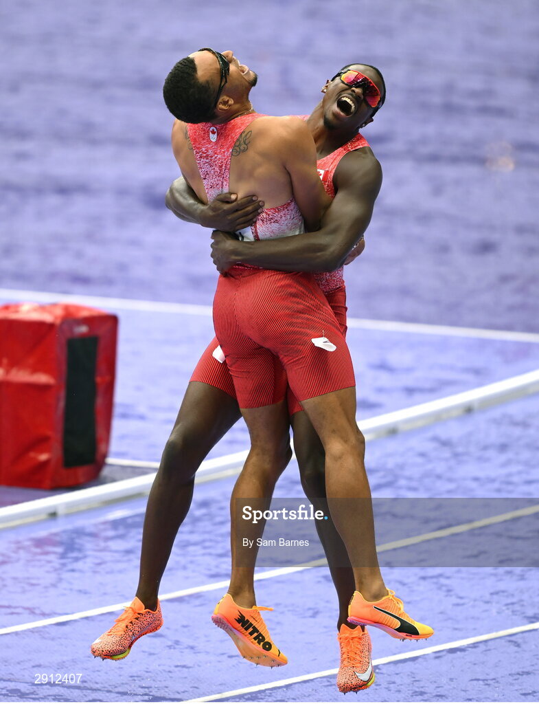9 August 2024; Andre De Grasse, left, and Aaron Brown of Team Canada celebrate after winning gold in the men's 4x100m relay final at the Stade de France during the 2024 Paris Summer Olympic Games in Paris, France. Photo by Sam Barnes/Sportsfile