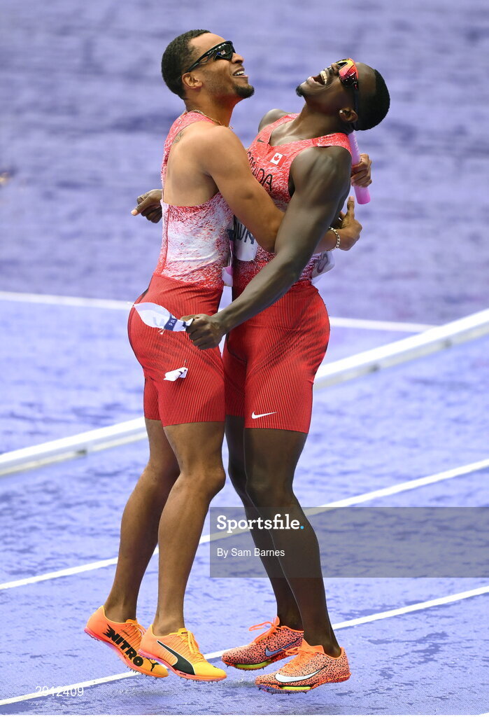 9 August 2024; Andre De Grasse, left, and Aaron Brown of Team Canada celebrate after winning gold in the men's 4x100m relay final at the Stade de France during the 2024 Paris Summer Olympic Games in Paris, France. Photo by Sam Barnes/Sportsfile