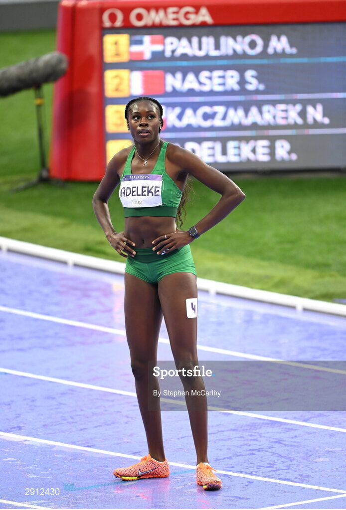 9 August 2024; Rhasidat Adeleke of Team Ireland reacts after finishing fourth in the women's 400m final at the Stade de France during the 2024 Paris Summer Olympic Games in Paris, France. Photo by Stephen McCarthy/Sportsfile