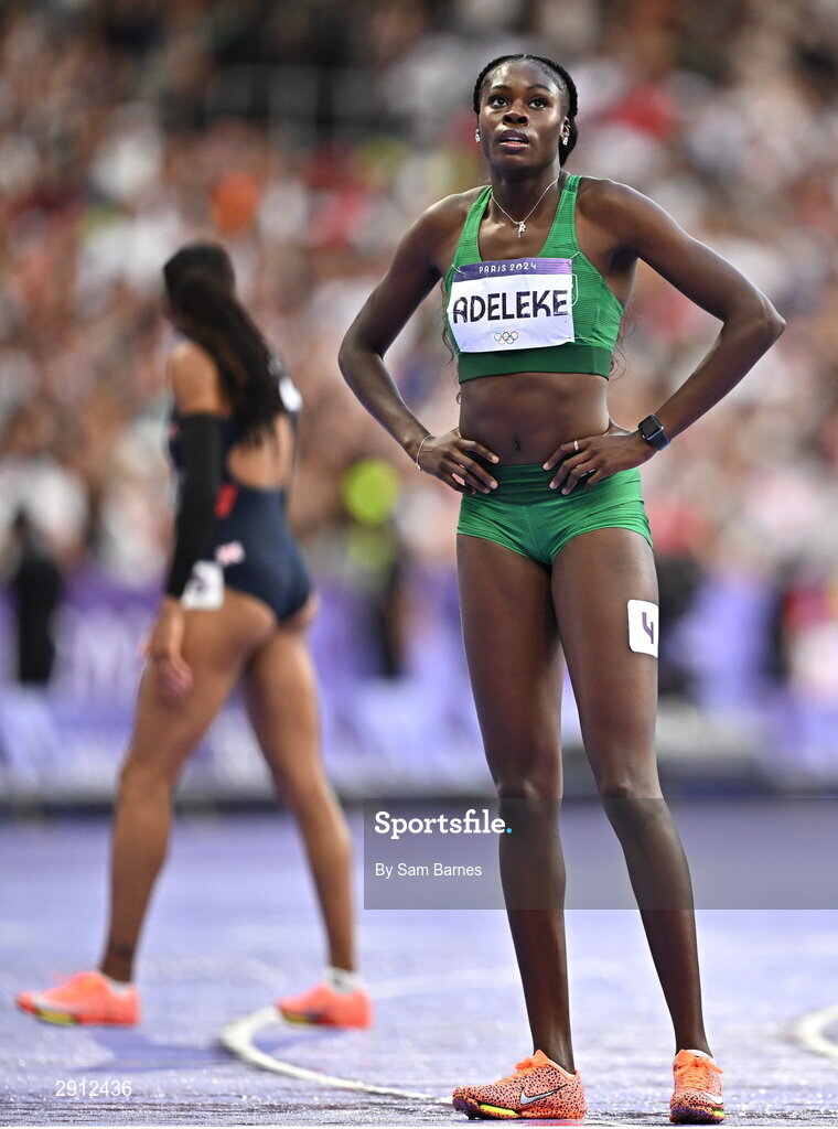 9 August 2024; Rhasidat Adeleke of Team Ireland reacts after finishing fourth in the women's 400m final at the Stade de France during the 2024 Paris Summer Olympic Games in Paris, France. Photo by Sam Barnes/Sportsfile