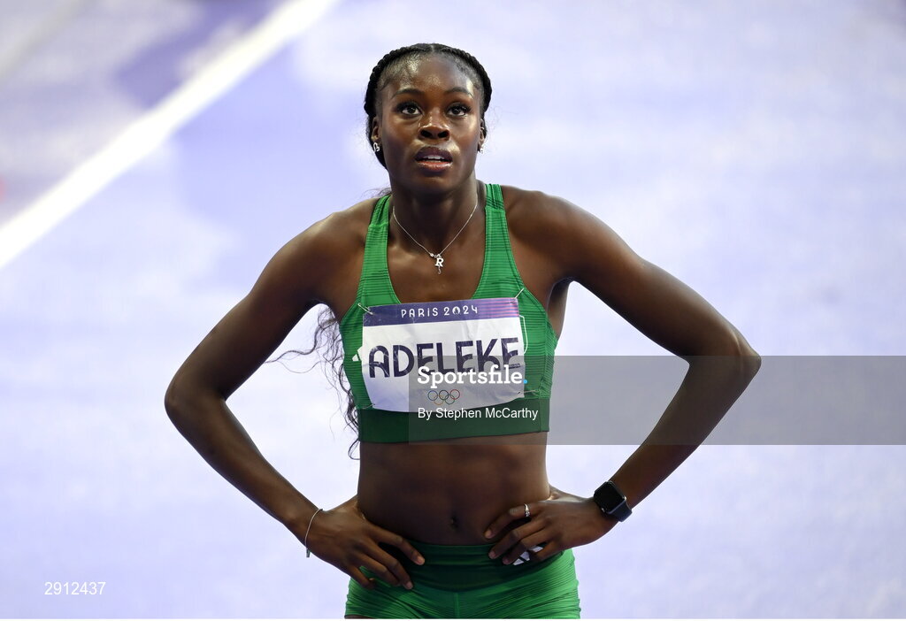 9 August 2024; Rhasidat Adeleke of Team Ireland reacts after finishing fourth in the women's 400m final at the Stade de France during the 2024 Paris Summer Olympic Games in Paris, France. Photo by Stephen McCarthy/Sportsfile