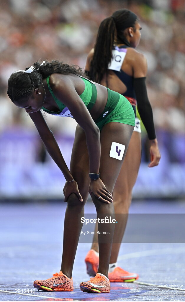 9 August 2024; Rhasidat Adeleke of Team Ireland reacts after finishing fourth in the women's 400m final at the Stade de France during the 2024 Paris Summer Olympic Games in Paris, France. Photo by Sam Barnes/Sportsfile