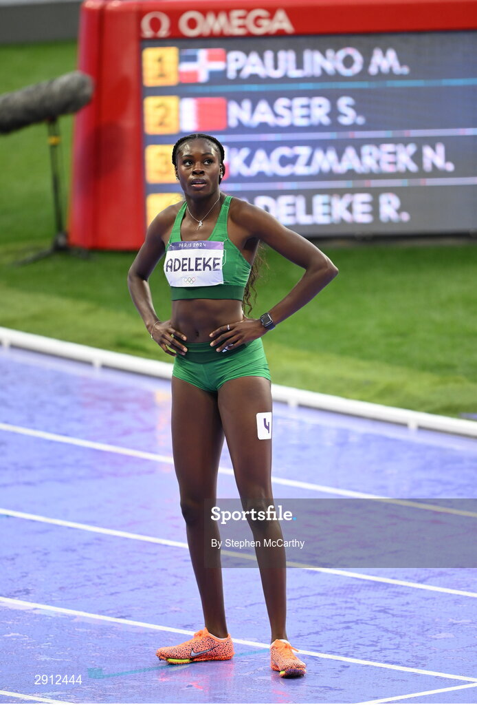 9 August 2024; Rhasidat Adeleke of Team Ireland reacts after finishing fourth in the women's 400m final at the Stade de France during the 2024 Paris Summer Olympic Games in Paris, France. Photo by Stephen McCarthy/Sportsfile