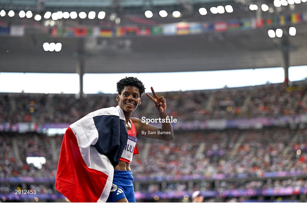 9 August 2024; Marileidy Paulino of Team Dominican Republic celebrates after winning gold in the women's 400m final at the Stade de France during the 2024 Paris Summer Olympic Games in Paris, France. Photo by Sam Barnes/Sportsfile
