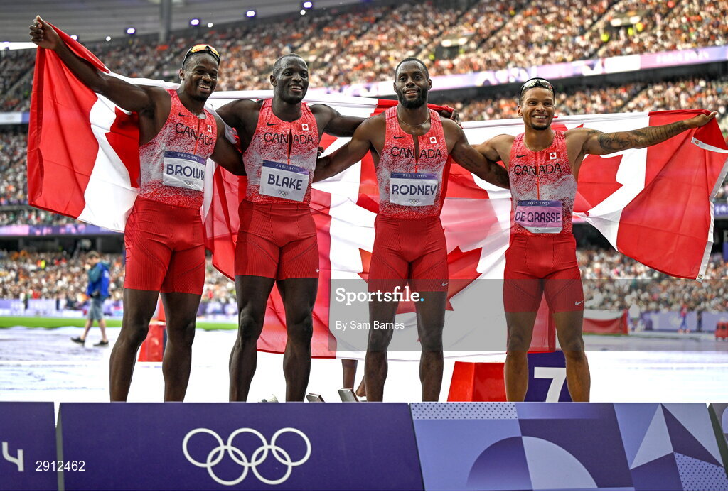 9 August 2024; Team Canada men's 4x100m relay team, from left, Aaron Brown, Jerome Blake, Brendon Rodney and Andre De Grasse celebrate winning gold after the men's 4x100m relay at the Stade de France during the 2024 Paris Summer Olympic Games in Paris, France. Photo by Sam Barnes/Sportsfile