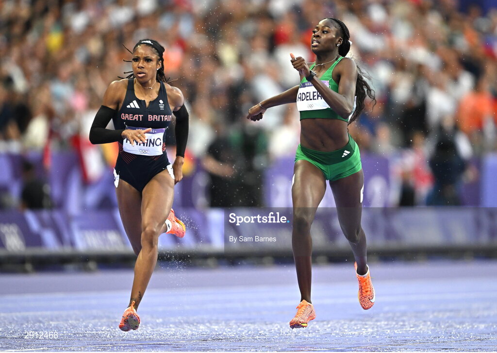 9 August 2024; Rhasidat Adeleke of Team Ireland, right, during the women's 400m final at the Stade de France during the 2024 Paris Summer Olympic Games in Paris, France. Photo by Sam Barnes/Sportsfile
