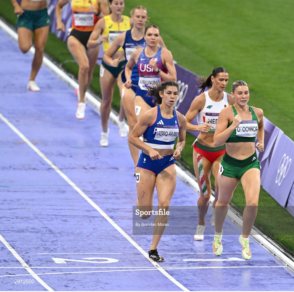 9 August 2024; Kate O'Connor of Team Ireland, right, during the women's heptathlon 800m final at the Stade de France during the 2024 Paris Summer Olympic Games in Paris, France. Photo by Brendan Moran/Sportsfile