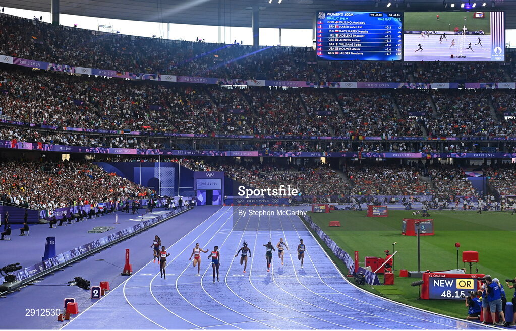 9 August 2024; Athletes, from left, Alexis Holmes of Team USA, Salwa Eid Naser of Team Bahrain, Natalia Kaczmarek of Team Poland, Marileidy Paulino of Team Dominican Republic, Amber Anning of Team Great Britain, Rhasidat Adeleke of Team Ireland, Henriette Jaeger of Team Norway and Sada Williams of Team Barbados during the women's 400m final at the Stade de France during the 2024 Paris Summer Olympic Games in Paris, France. Photo by Stephen McCarthy/Sportsfile