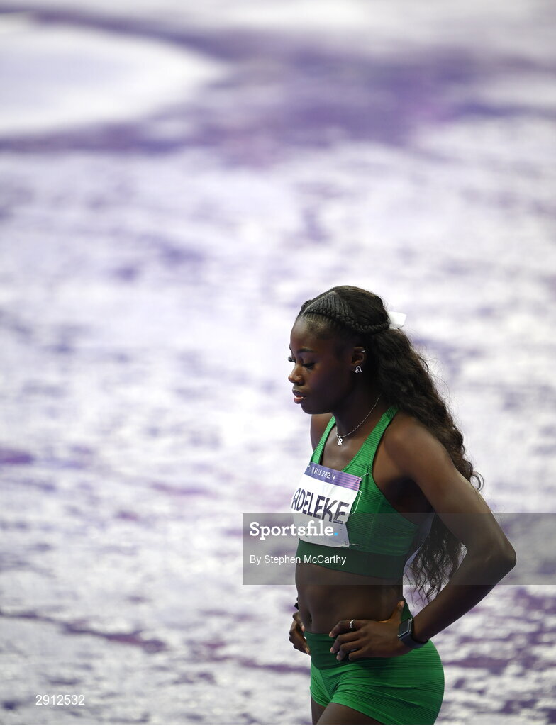 9 August 2024; Rhasidat Adeleke of Team Ireland before the women's 400m final at the Stade de France during the 2024 Paris Summer Olympic Games in Paris, France. Photo by Stephen McCarthy/Sportsfile