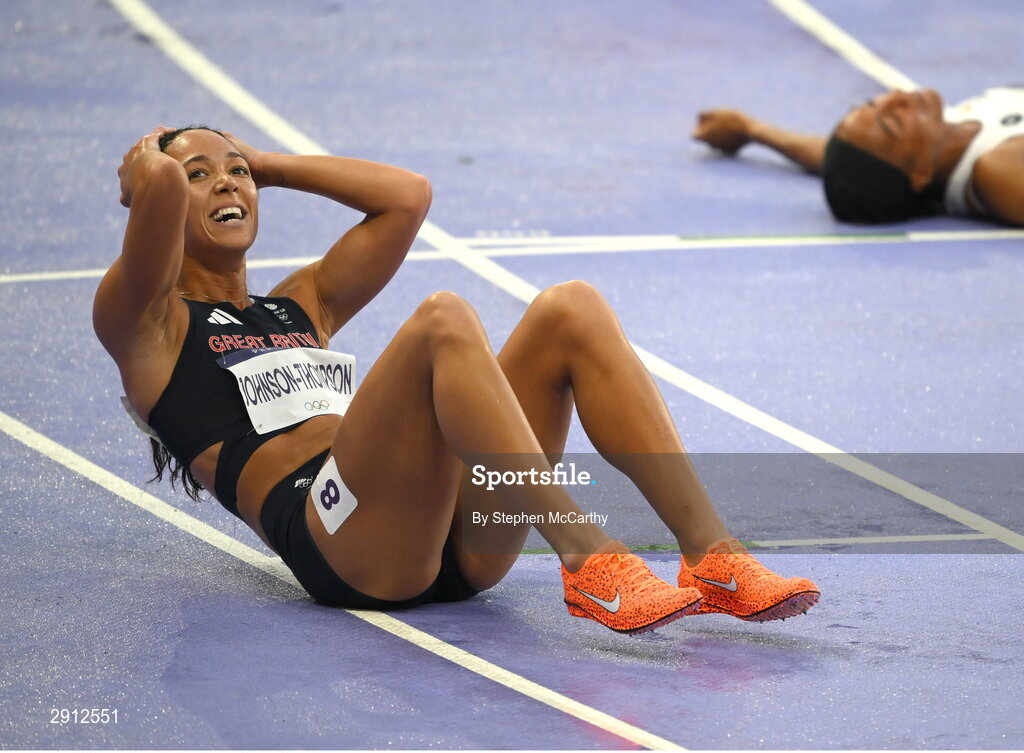 9 August 2024; Katarina Johnson-Thompson of Team Great Britain after competing in the women's heptathlon 800m final at the Stade de France during the 2024 Paris Summer Olympic Games in Paris, France. Photo by Stephen McCarthy/Sportsfile