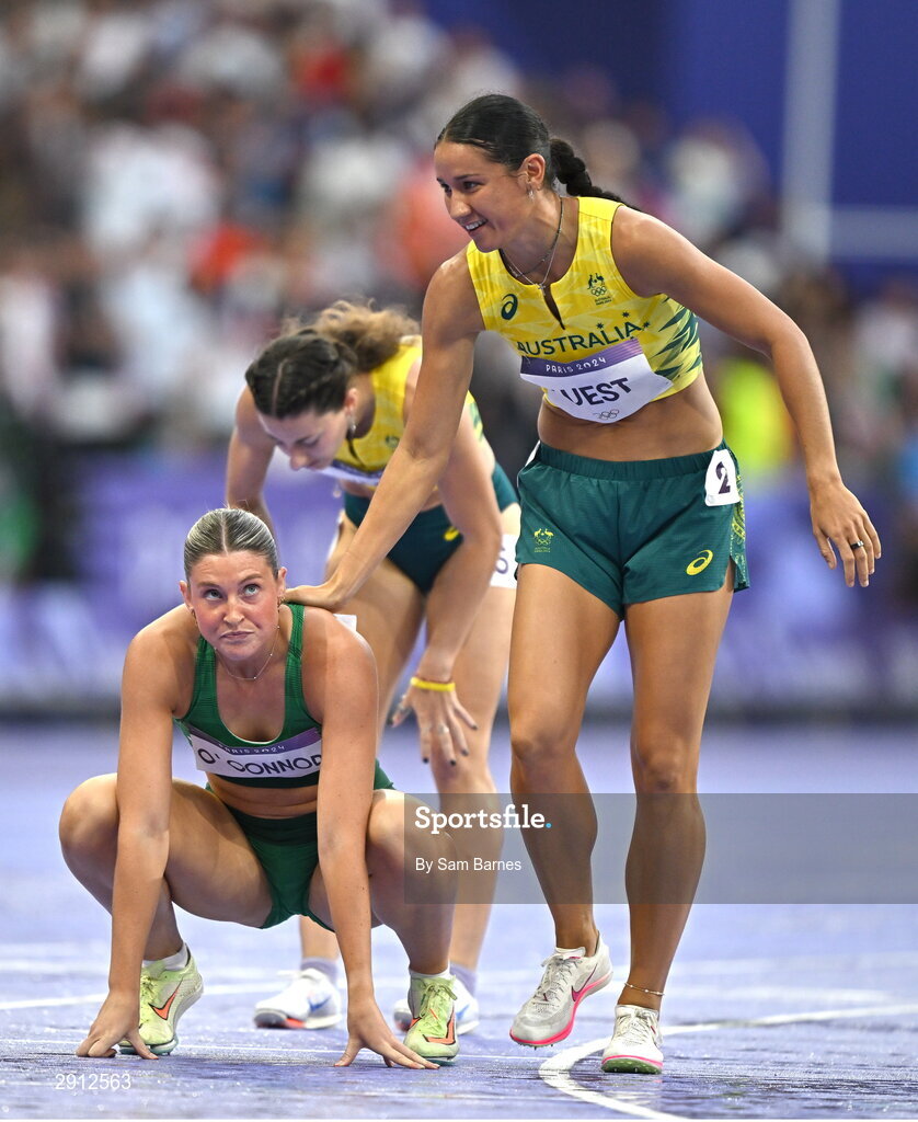 9 August 2024; Kate O'Connor of Team Ireland, left, after competing in the women's heptathlon 800m final at the Stade de France during the 2024 Paris Summer Olympic Games in Paris, France. Photo by Sam Barnes/Sportsfile