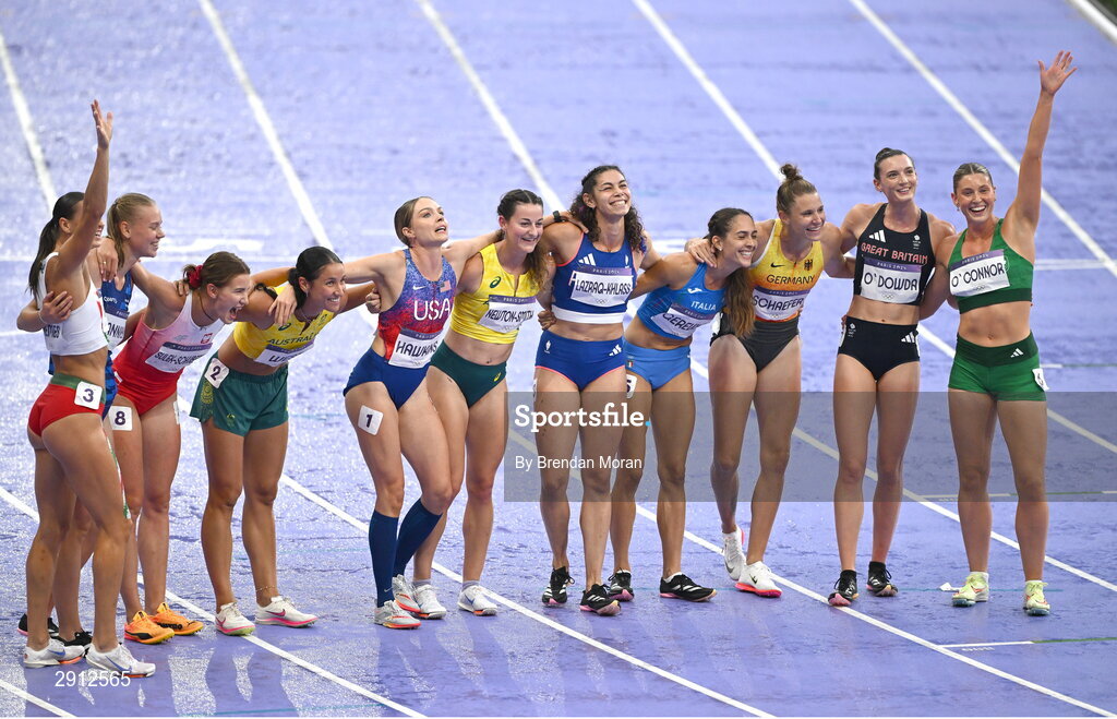 9 August 2024; Kate O'Connor of Team Ireland, right, after competing in the women's heptathlon 800m final at the Stade de France during the 2024 Paris Summer Olympic Games in Paris, France. Photo by Brendan Moran/Sportsfile