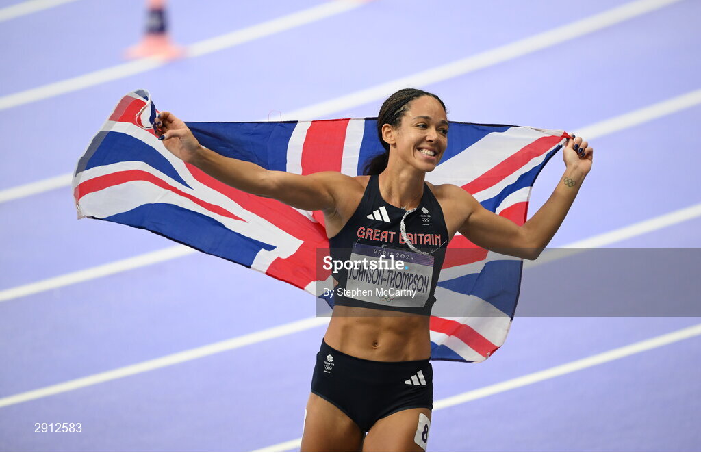 9 August 2024; Katarina Johnson-Thompson of Team Great Britain after competing in the women's heptathlon 800m final at the Stade de France during the 2024 Paris Summer Olympic Games in Paris, France. Photo by Stephen McCarthy/Sportsfile