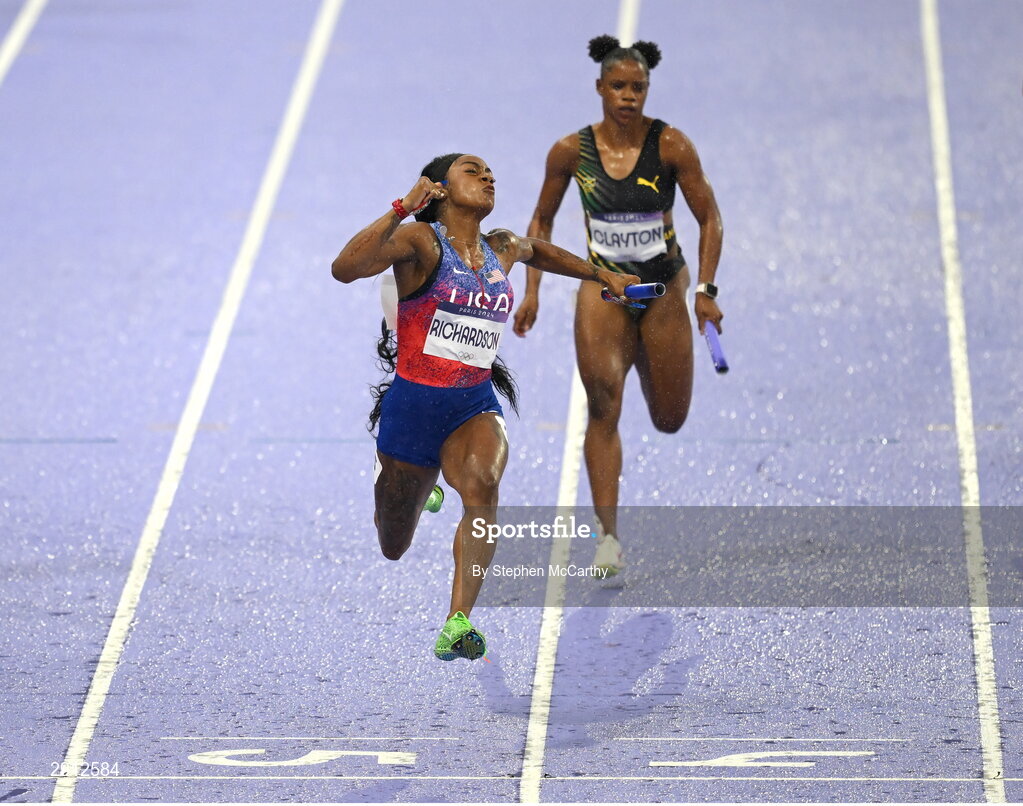9 August 2024; Sha'carri Richardson of Team USA celebrates winning the women's 4x100m relay at the Stade de France during the 2024 Paris Summer Olympic Games in Paris, France. Photo by Stephen McCarthy/Sportsfile