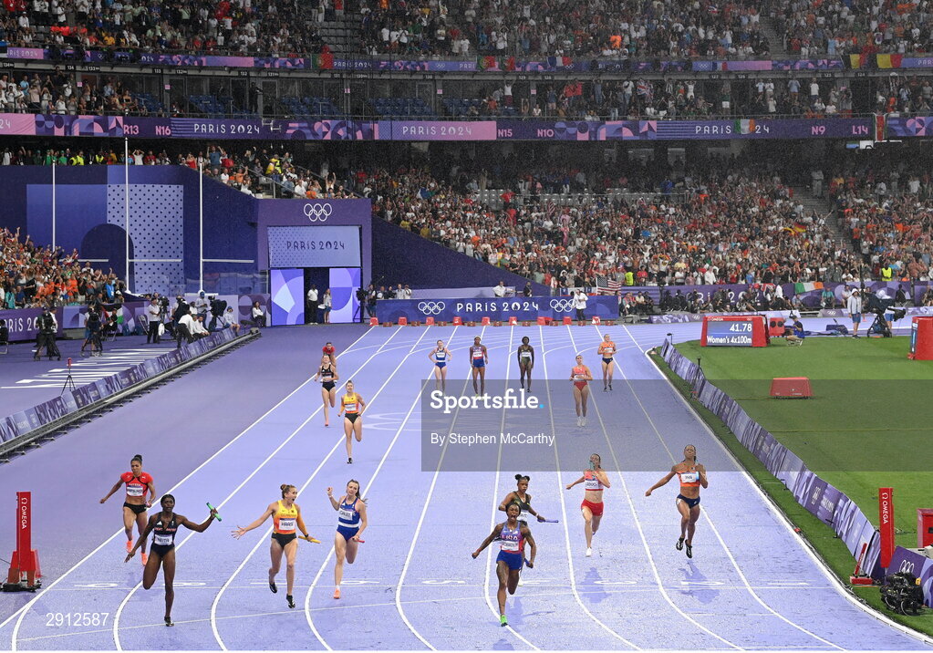 9 August 2024; Sha'carri Richardson of Team USA, fourth from right, celebrates winning the women's 4x100m relay at the Stade de France during the 2024 Paris Summer Olympic Games in Paris, France. Photo by Stephen McCarthy/Sportsfile