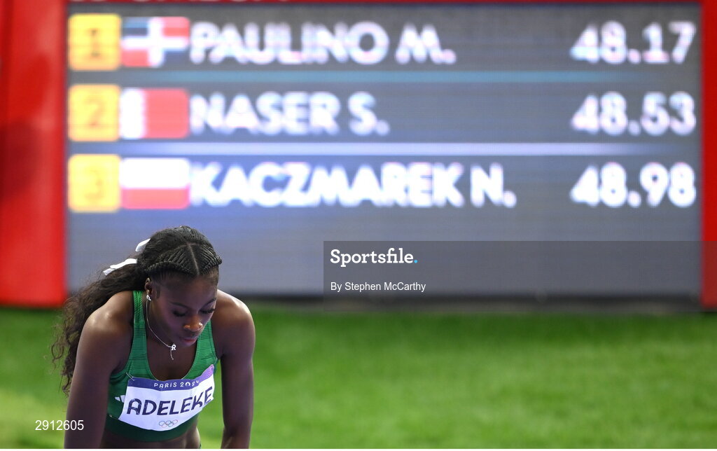 9 August 2024; Rhasidat Adeleke of Team Ireland after the women's 400m final at the Stade de France during the 2024 Paris Summer Olympic Games in Paris, France. Photo by Stephen McCarthy/Sportsfile