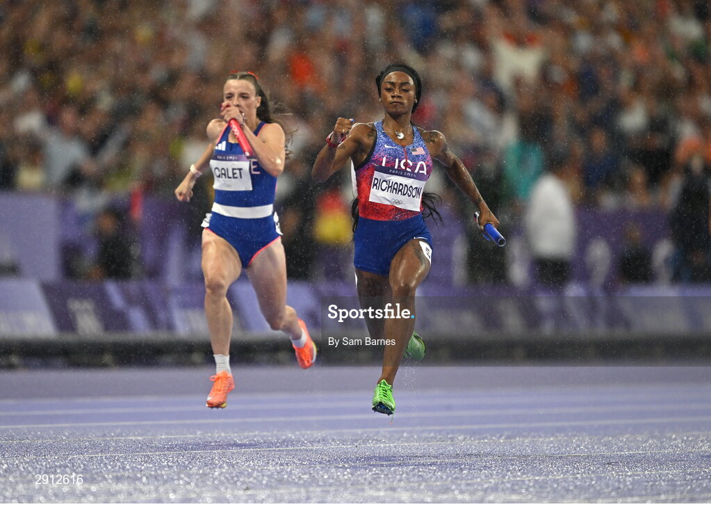 9 August 2024; Sha'carri Richardson of Team USA, right, on her way to winning the women's 4x100m relay at the Stade de France during the 2024 Paris Summer Olympic Games in Paris, France. Photo by Sam Barnes/Sportsfile