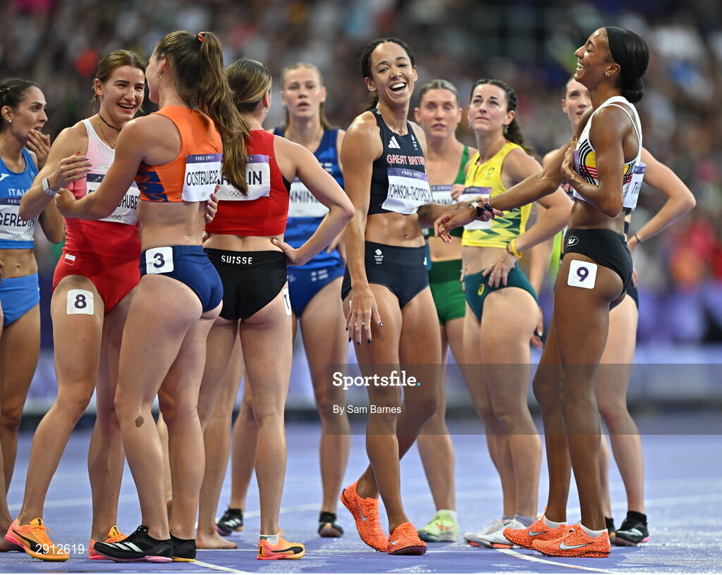 9 August 2024; Katarina Johnson-Thompson of Team Great Britain, centre, after the women's heptathlon 800m final at the Stade de France during the 2024 Paris Summer Olympic Games in Paris, France. Photo by Sam Barnes/Sportsfile