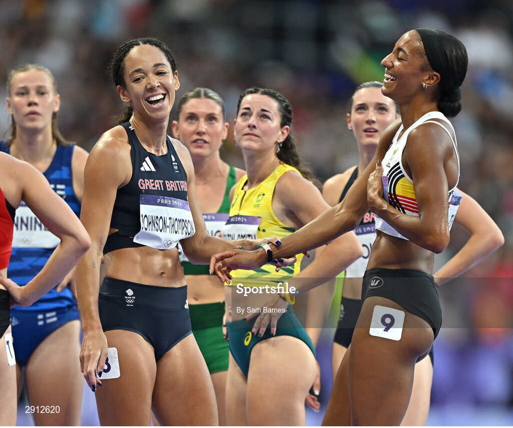 9 August 2024; Katarina Johnson-Thompson of Team Great Britain, left, and Nafissatou Thiam of Team Belgium after the women's heptathlon 800m final at the Stade de France during the 2024 Paris Summer Olympic Games in Paris, France. Photo by Sam Barnes/Sportsfile