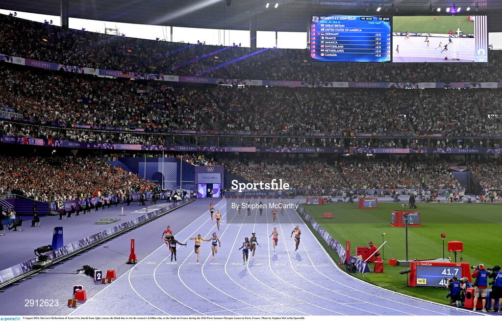 9 August 2024; Sha'carri Richardson of Team USA, fourth from right, crosses the finish line to win the women's 4x100m relay at the Stade de France during the 2024 Paris Summer Olympic Games in Paris, France. Photo by Stephen McCarthy/Sportsfile