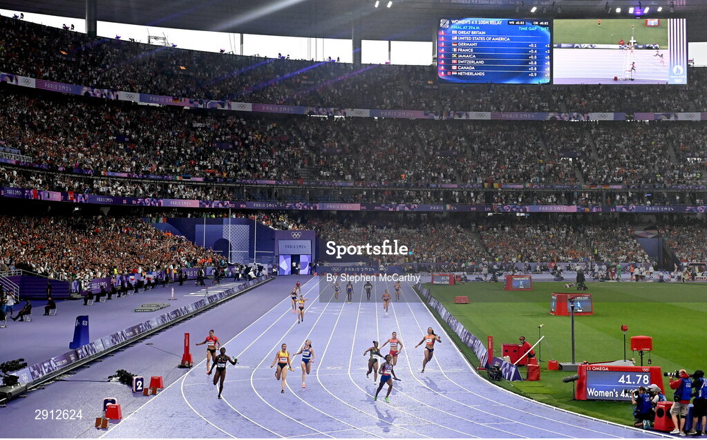 9 August 2024; Sha'carri Richardson of Team USA, fourth from right, crosses the finish line to win the women's 4x100m relay at the Stade de France during the 2024 Paris Summer Olympic Games in Paris, France. Photo by Stephen McCarthy/Sportsfile