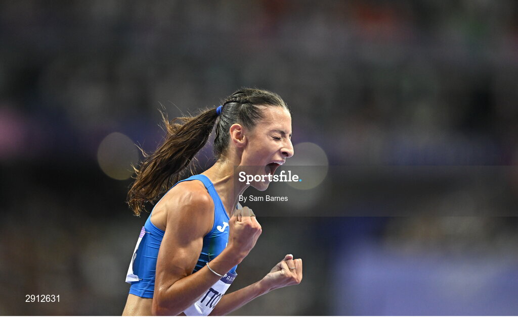 9 August 2024; Nadia Battocletti of Team Italy celebrates after finshing second in the women's 10,000m final at the Stade de France during the 2024 Paris Summer Olympic Games in Paris, France. Photo by Sam Barnes/Sportsfile