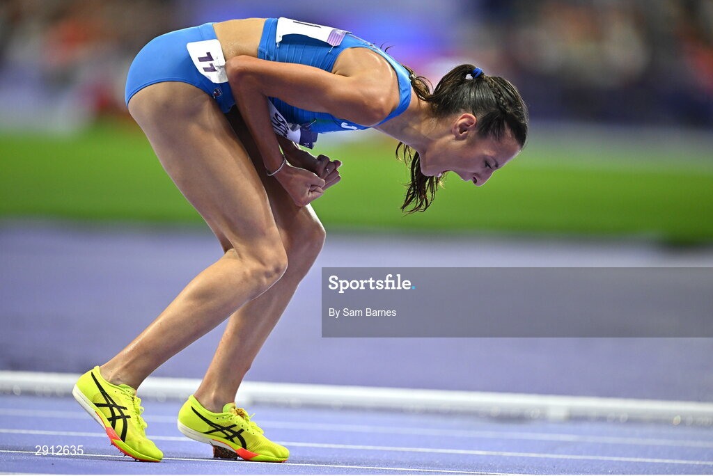 9 August 2024; Nadia Battocletti of Team Italy celebrates after finshing second in the women's 10,000m final at the Stade de France during the 2024 Paris Summer Olympic Games in Paris, France. Photo by Sam Barnes/Sportsfile
