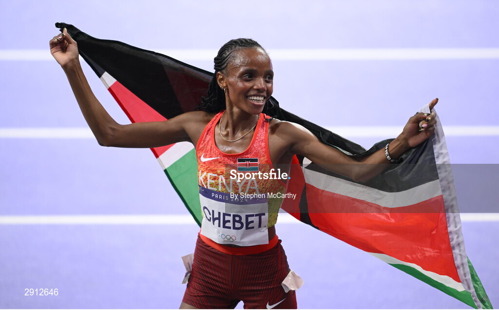 9 August 2024; Beatrice Chebet of Team Kenya celebrates after winning the women's 10,000m final at the Stade de France during the 2024 Paris Summer Olympic Games in Paris, France. Photo by Stephen McCarthy/Sportsfile