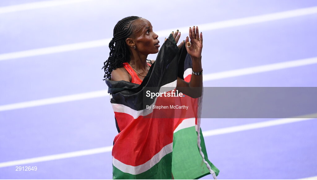 9 August 2024; Beatrice Chebet of Team Kenya celebrates after winning the women's 10,000m final at the Stade de France during the 2024 Paris Summer Olympic Games in Paris, France. Photo by Stephen McCarthy/Sportsfile